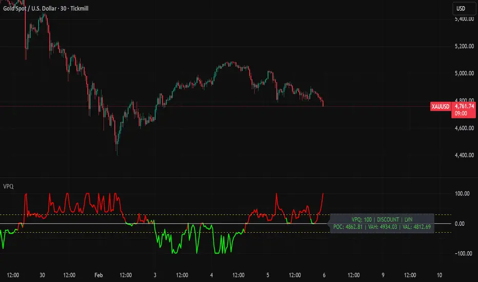VPQ uses an original mathematical model that calculates precise price positioning relative to volume-weighted fair value. This is not a simple "above/below POC" calculation - it's a multi-factor equation that considers: