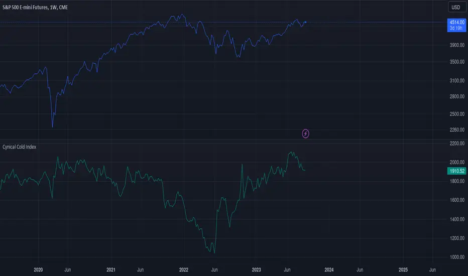 This TradingView indicator calculates the Cynical Cold Index, which is a weighted basket of commodity prices designed to track economic conditions. It compares the price of a given asset to the index value.