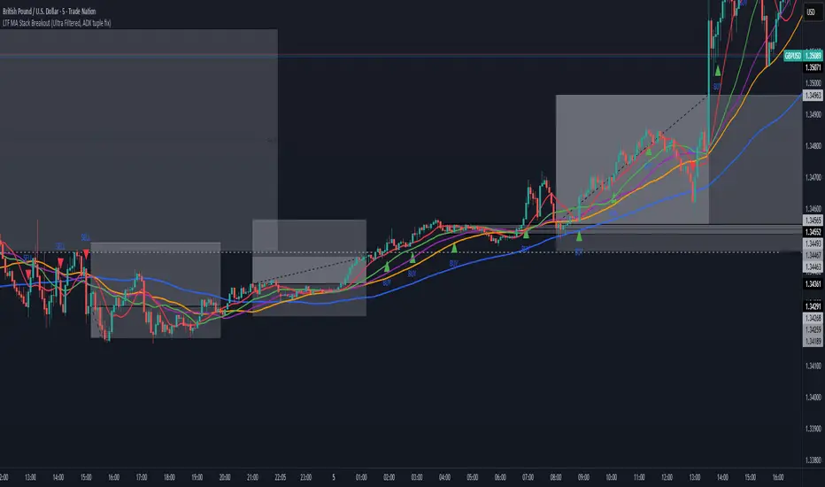 This tool is an advanced, multi-layered breakout and trend-following indicator designed for lower timeframes. It identifies high-conviction buy and sell signals by combining moving average stacking with a suite of professional-grade filters.