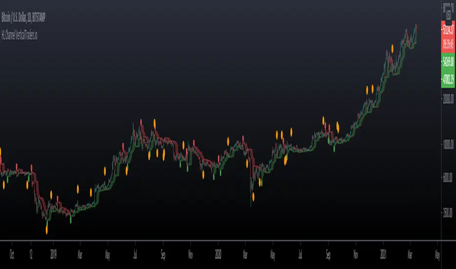 - The channel shows the trend based on highs and lows, and possible points of take profit and exists
