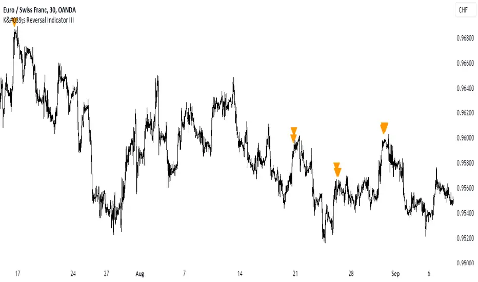 K's Reversal Indicator III is based on the concept of autocorrelation of returns. The main theory is that extreme autocorrelation (trending) that coincide with a technical signals such as one from the RSI, may result in a powerful short-term signal that can be exploited.