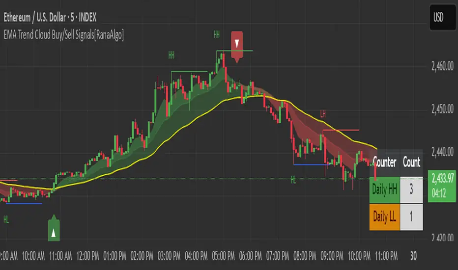 Güncellendi EMA Trend Cloud with HH/LL Counter [RanAlgo]