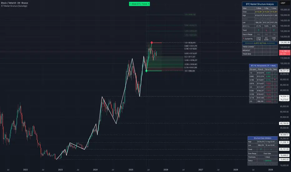 - tracks ICT market structure across three core timeframes (1-Week, 1-Day, 1-Hour) simultaneously.