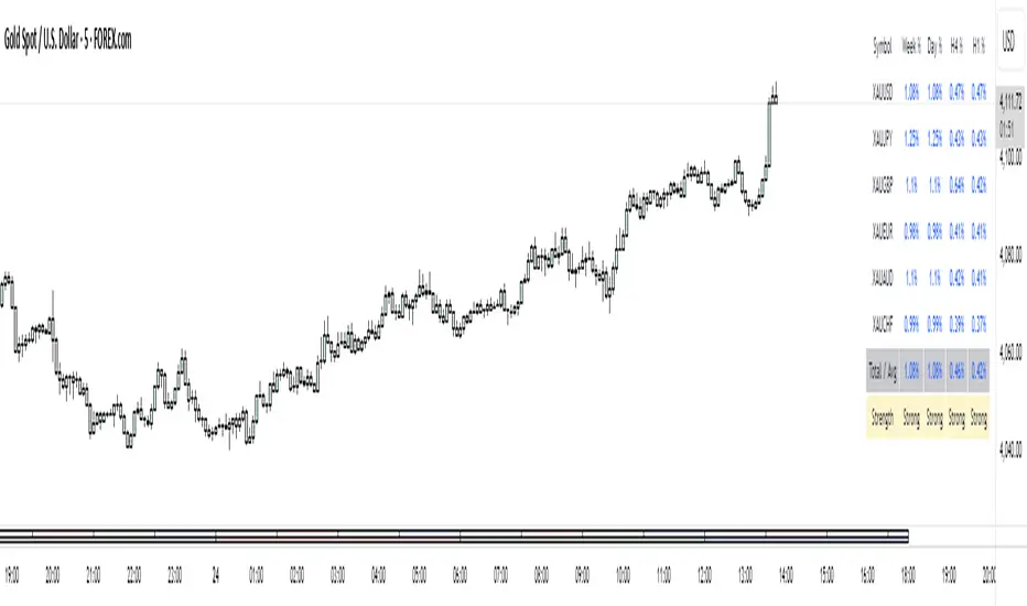 This indicator tracks gold across Daily (D), 1-Hour (H1), 4-Hour (H4), and Weekly (W) timeframes, providing a comprehensive view of both short-term and long-term market movements. The Total Average Calculation consolidates data from all timeframes, allowing traders to instantly see the overall trend strength of XAU. Positive movements are highlighted in blue, negative movements in red, while the Total Average gives a quick read of market momentum.