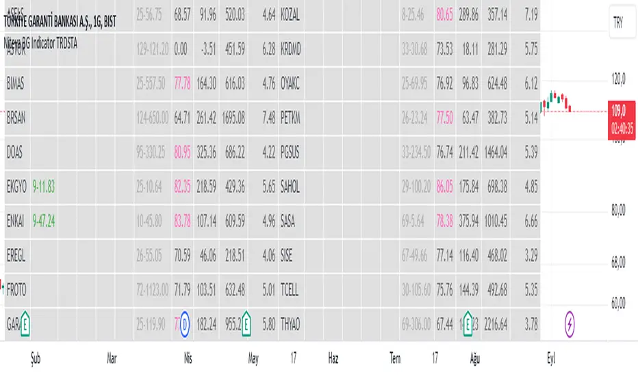 Niteya BG Indicator TRDSTA indikatörü, Niteya BG Strategy TRDSTA stratejisi ile 30 değer için oluşturulan long işlem giriş ve çıkış, kar alma seviyeleri, karlı yüzde ve net kar yüzde değerlerini tek bir tablo üzerinden takip etmek için kullanılır.