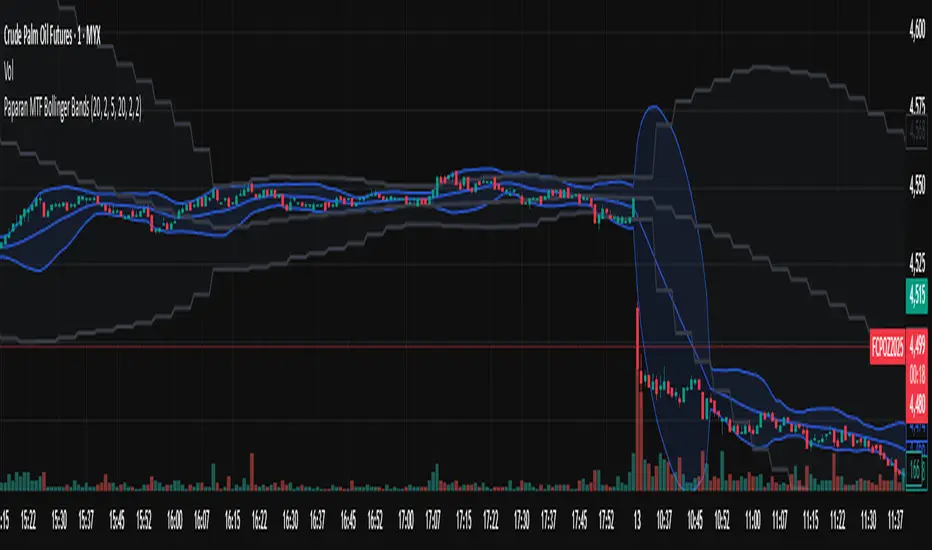 LTF Calculation: It calculates the Bollinger Bands normally using the price data from the timeframe you are currently viewing on your chart (e.g., 15-Minute). The result is the blue lines that move smoothly with each candle.