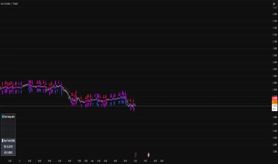 The "TMB_SMC_Strategy_v1.1.3" combines a classic trend filter using two EMAs with contrarian RSI entries and simple SMC elements (Fair Value Gaps & Order Blocks). Stop-loss and take-profit orders are volatility-adaptive and controlled via the ATR. An integrated dashboard displays the setup status, stop-loss/take-profit levels, entry reference, and trend, RSI, and ATR values.