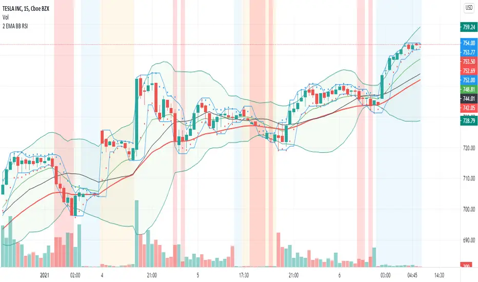 This Indicator (2 EMA -BB - RSI ) plots 2 EMA's along with Bollinger Bands and paints RSI Overbought & Oversold Zones on Chart.