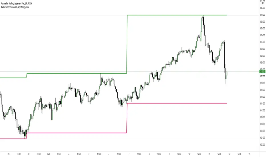 The D,W,M Previous High / Low is Great! However many times I found it would be great to see current D,W,M High/Low as well. So here you have both Current and Previous in the same indicator. Enjoy!Açık kaynak kodlu komut dosyası