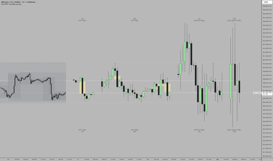 E9 MTF Candle Array plots up to six selectable higher-timeframe candle sets (e.g., H1/H4/D1/W1) as “mini candles” stacked to the right of your chart for fast multi-TF context. For each HTF, it also draws a shaded High–Low range box on the main chart that spans the candle’s time window and updates in real time as the current HTF candle forms, then “locks” the prior box when a new HTF candle opens. Optional features include HTF labels and countdown timers, Open/Close/High/Low trace lines with price labels, day/interval markers, and imbalance highlighting (FVG/VI) on the displayed HTF candle array.