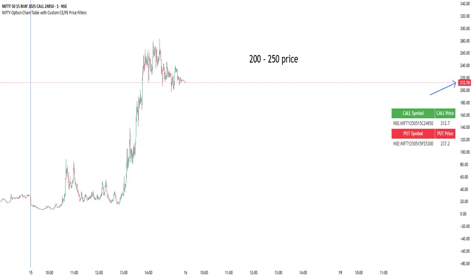 This Pine Script creates a powerful and visually organized option chain dashboard for NIFTY Index Options, showing 10 Call Options (CE) and 10 Put Options (PE), with real-time prices updated on a 5-minute chart.