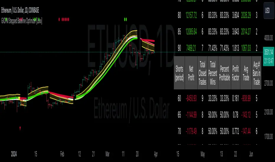 The GKD-M Stepped Baseline Optimizer is an advanced component of the Giga Kaleidoscope Modularized Trading System (GKD), designed to enhance trading strategy development by dynamically optimizing Baseline moving averages. This tool allows traders to evaluate over 65 moving averages, adjusting them across multiple periods to identify which settings yield the highest win rates for their trading strategies. The optimizer systematically tests these moving averages across specified timeframes and intervals, offering insights into net profit, total closed trades, win percentages, and other critical metrics for both long and short positions. Traders can define the initial period and incrementally adjust this value to explore a wide range of periods, thus fine-tuning their strategies with precision. What sets the GKD-M Stepped Baseline Optimizer apart is its unique capability to adapt the baseline moving average according to the highest win rates identified during backtesting, at each trading candle. This win-rate adaptive approach ensures that the trading system is always aligned with the most effective period settings for the selected moving average, enhancing the system's overall performance. Moreover, the 'stepped' aspect of this optimizer introduces a filtering process based ons, significantly reducing market noise and ensuring that identified trends are both significant and reliable. This feature is critical for traders looking to mitigate the risks associated with volatile market conditions and to capitalize on genuine market movements.In essence, the GKD-M Stepped Baseline Optimizer is tailored for traders who utilize the GKD trading system, offering a sophisticated tool to refine their baseline indicators dynamically, ensuring that their trading strategies are continuously optimized for maximum efficacy.