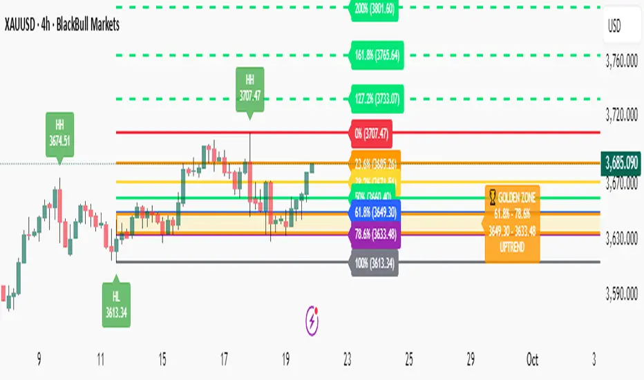 🔄 Trend-Aware Golden Zone: Automatically adjusts 61.8%-78.6% zone based on market direction