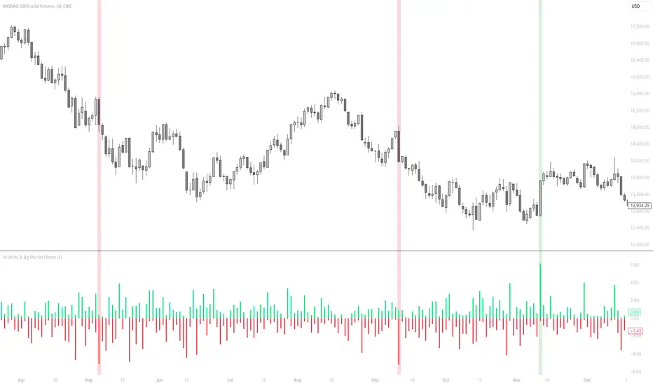 This indicator shows the volatility per candle, and highlights candles where volatility exceeds a defined threshold.