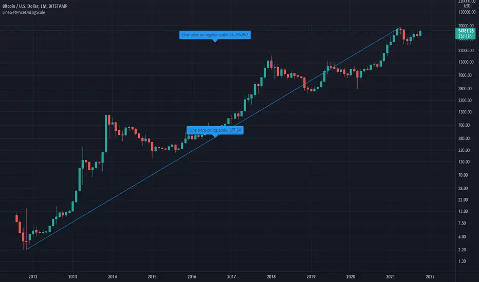 The built-in `line.get_price()` function only works with linear scale and gives incorrect results when the chart is in Log scale.