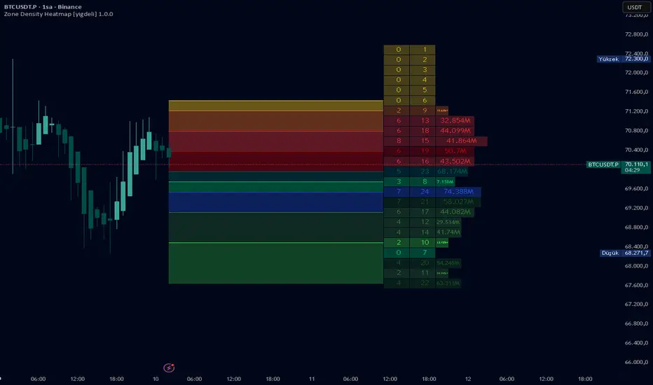 Zone Density Heatmap is a visualization-focused indicator that displays aggregated interaction and volume data using vertically stacked zones.