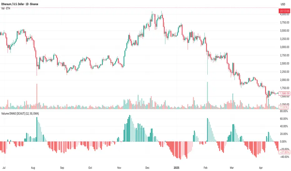 The Volume DMAO (Dual Moving Average Oscillator) applies PPO-style calculation to volume data rather than price. It measures the percentage difference between fast and slow moving averages of volume, providing insights into volume momentum and market participation trends.