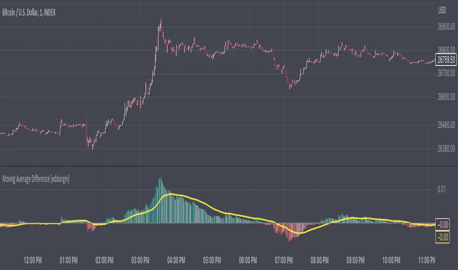A positive moving average difference indicates that the price is above the moving average difference (i.e. the weighted average of all moving average differences between your two selected moving averages). A negative moving average difference indicates that the price is below the moving average difference. I have added a signal with a configurable length input as well to smooth out trends.