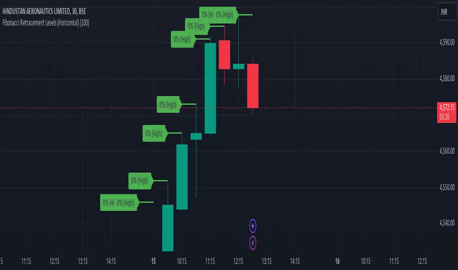 Horizontal Lines: I've added horizontal lines for each Fibonacci retracement level (0%, 23.6%, 38.2%, 50%, 61.8%, 100%), starting from the current bar index to ensure they extend horizontally across the chart.