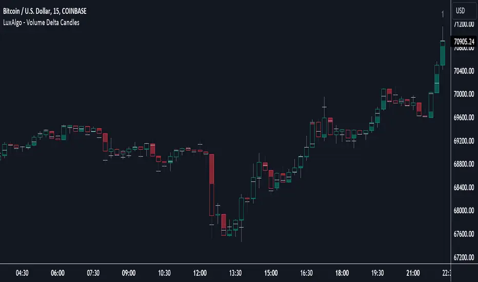 Volume Delta Candles provides insights about Intrabar trading activity in an easy-to-interpret manner. Lower timeframe or real-time data is used for displaying Volume Delta percentage against the total volume as a coloured bar part.