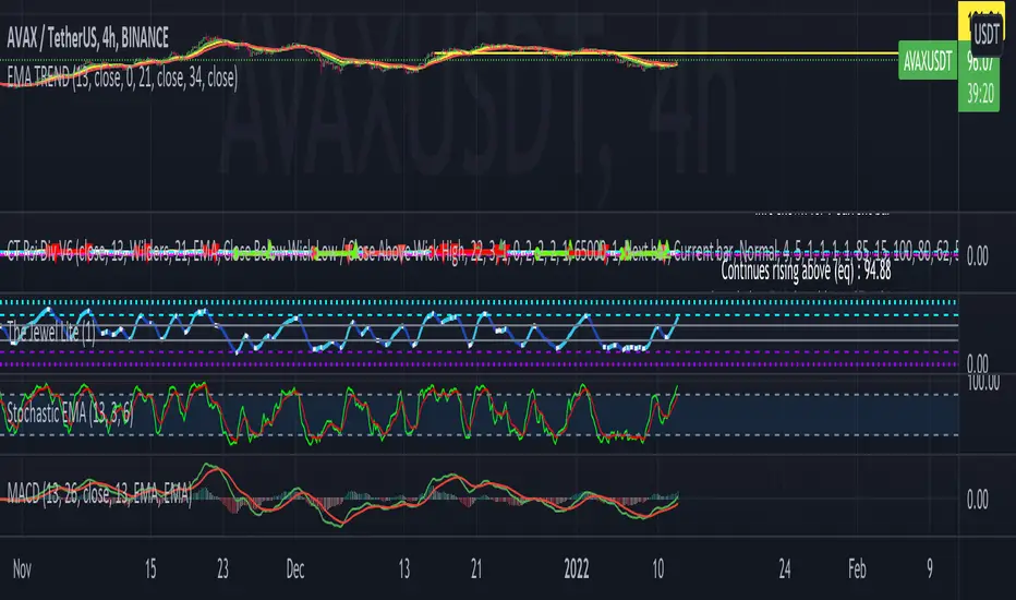 This EMA Trend indicator uses the 13 EMA, 21 EMA, and 34 EMA in the following color codes of Green for 13 EMA, Yellow for 21 EMA, and Red for 34 EMA lines to demonstrate overall trend when applied to the chart. Instead of just one EMA line, using three EMA lines to determine the trend. Use this indicator to in the following method. If the green angled up along with yellow and red, there is strong upward trend. If the green crosses below the yellow, trend is waning. If the red is on top of the yellow and green with downward slope, there is a strong downward trend.
