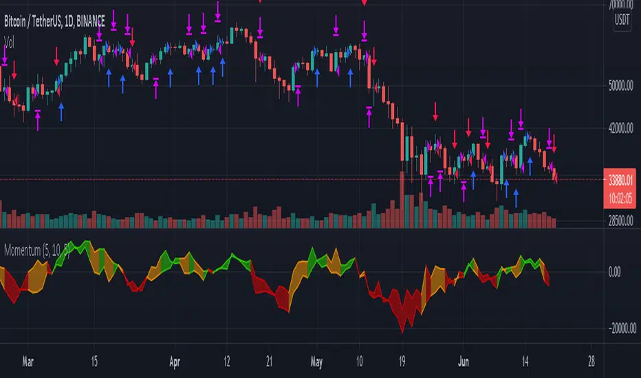 This strategy idea uses two, fast and slow, momentum indicators for trade setups and exits. This is a fast reacting strategy which is very useful in trending instruments on 1D and 4H timeframes. This is the implementation used in QuantCT app.