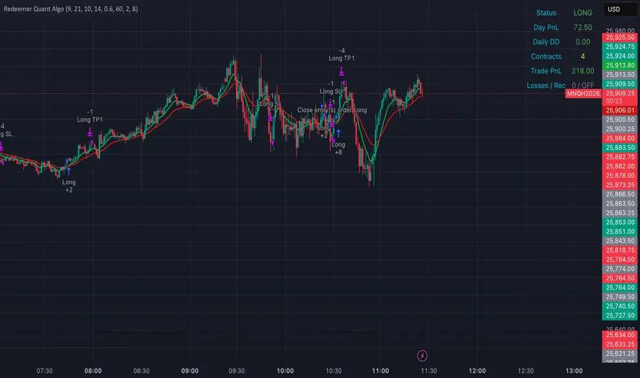 Redeemer Quant Algo is a rules-based EMA trend and swing-structure strategy built for educational and research purposes. It operates on a clearly defined framework that evaluates trend direction, sets risk from market structure, and adapts position size through a controlled recovery sequence. The system is designed to demonstrate how disciplined logic can be applied to futures markets without discretionary decision-making.