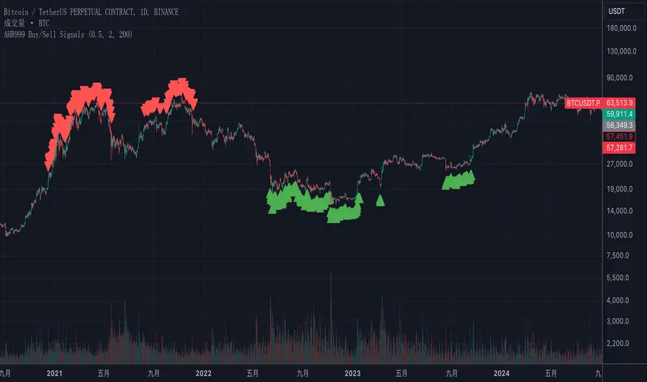 This Pine Script indicator combines the AHR999 metric with Bitcoin's historical price trends to provide clear buy and sell signals, assisting you in making informed trading decisions at crucial moments. It calculates the AHR999 index based on Bitcoin's 200-day Geometric Moving Average (GMA) and the estimated price, offering customizable buy and sell thresholds for precise entry and exit points. Ideal for traders looking to capture long-term investment trends, this indicator helps you effectively identify Bitcoin market opportunities.