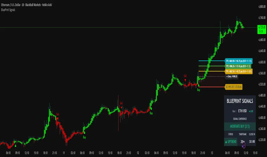 Blueprint Signals Pro is an advanced, all-in-one trading indicator designed for TradingView, built to provide high-quality buy/sell signals across various markets including cryptocurrencies, U.S. stocks, Indian indices, forex, and more. 📈 It leverages a proprietary ATR-based trailing stop mechanism combined with AI-optimized profiles for different trading styles (scalping, intraday, swing, and position trading) to generate reliable signals on bar close.