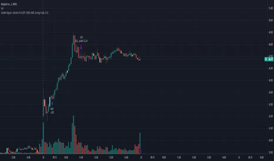 This market-first trading strategy gives BUY, SHORT, and CLOSE signals based on volume, trend, and relative strength or weakness to the market (SPY by default, can be customized). This indicator is useful for signaling day-trade entries and exits for tickers that are strong (or weak) against the market.