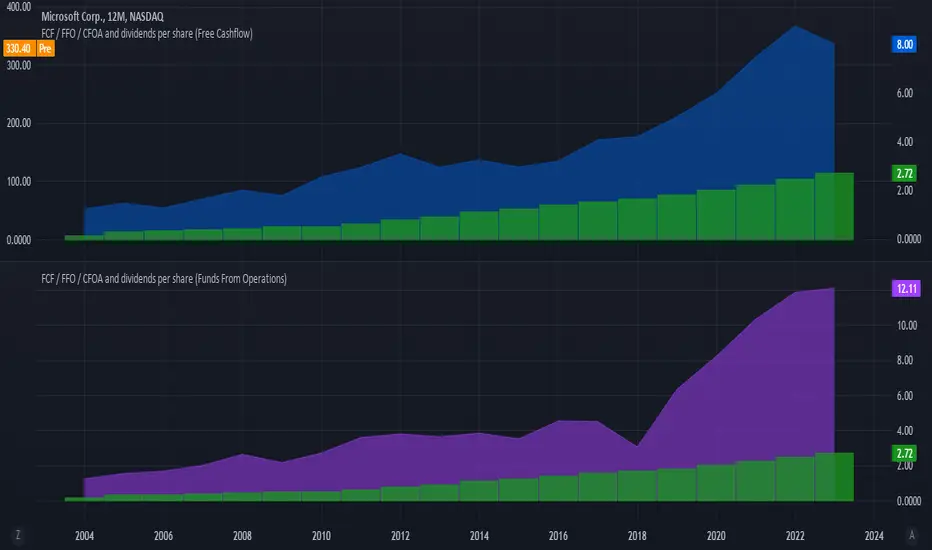 The indicator shows the Free Cashflow, Funds From Operations or Cash From Operating Activities per share and you can compare it to the dividends per share. You can see at a glance whether the dividends could be paid by one of this KPI. Please use the 12M time unit for the best result.
