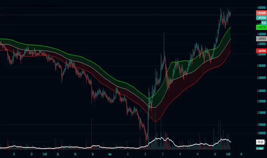 First the indicators takes a range, by default it is 22 candles, then finds the highest and lowest points of said range. At this point your left with lines that follow your support and resistance in the given range (take a look by change the 100 ema in settings to 1). To take things a step further I took a 100 candle ema of the highest highest and lowest lows to not only smooth things out, but also to provide visual ques for breakouts, when closing price is above the top band the asset is considered to be breaking out.