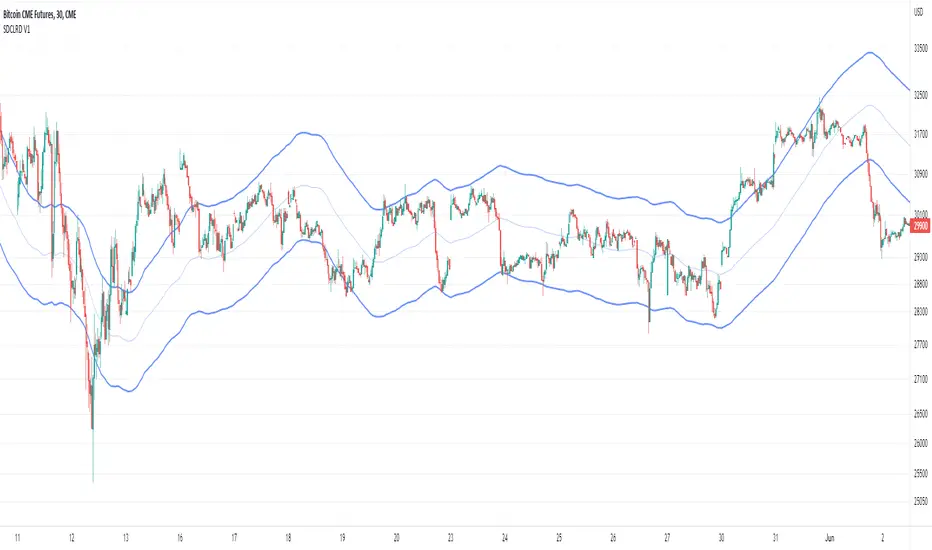 The indicator calculates the distance between linear regression line and the data point (price) as a percentage , then calculates the standard deviation for the linear regression distance , then draw the channel of two lines depending on the values of standard deviation .