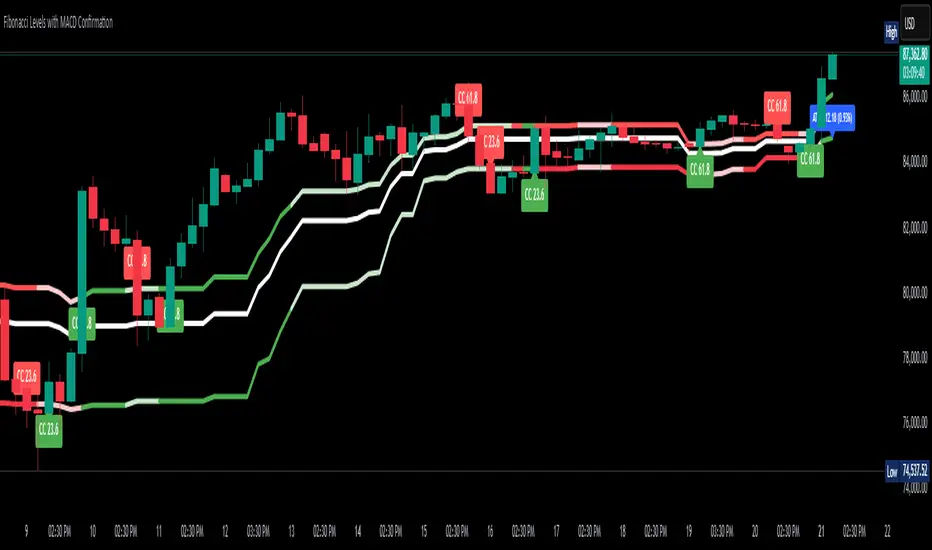 The script labels these zones with "CC 23.6" and "CC 61.8" when the price crosses them with MACD histogram confirmation: