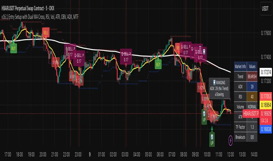 "Dual MA Cross with RSI, Volume, ATR, OBV, ADX, Reversals & Quality Signals"
