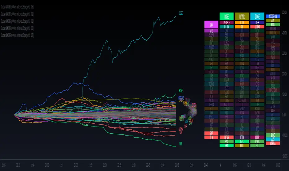 While the Compare tool only allows for % returns and absolute value on the chart asset or separate scale, Cuban's Open Interest Spaghetti allows the trader to use a separate oscillator window with the open interest on a % scale. This gives the trader the ability to watch OI changes in real-time within any Tradingview window.