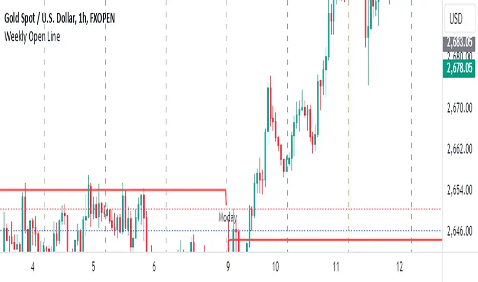 This indicator displays the weekly open price on the chart. It automatically updates every Monday to reflect the opening price of the current week. A dashed line is drawn to indicate the weekly open, and a label stating "Monday" is shown on each Monday for easy identification.