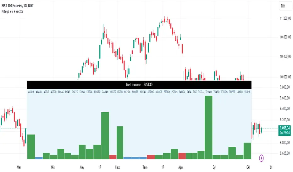 Niteya BG Fundamentals Sector is a fundamental analysis indicator that evaluates 531 BIST stocks in 46 sectors on a sectoral basis according to 222 different fundamental analysis data defined in TradingView Platform and displays the results graphically on the screen.