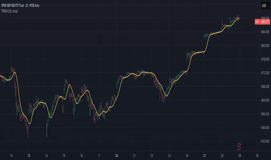 * **Signal generation:** Crossovers between price and TRIMA generate trade signals with fewer false alarms than SMA