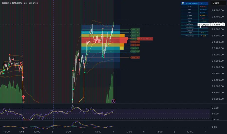 The indicator automatically identifies the Point of Control (POC) – the price level with the highest traded volume – as well as the Value Area, where typically 70% of the volume is concentrated. These zones serve as important support and resistance areas. Additionally, High Volume Nodes (HVN) are marked as potential reaction zones, and Low Volume Nodes (LVN) as areas where price might move through quickly.