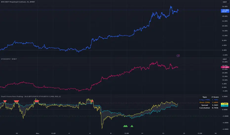 Dual Z-Score Pairs Trading IndicatorA statistical arbitrage strategy using dual timeframe Z-scores to identify trading opportunities between highly correlated pairs, optimized for crypto markets like BTC/USDT vs ETH/USDT.