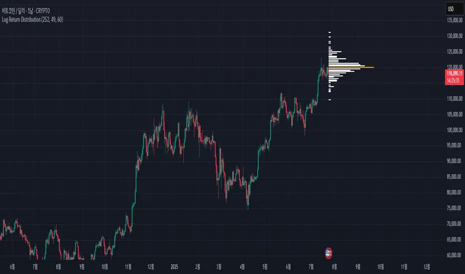 This indicator calculates the statistical distribution of logarithmic returns over a user-defined lookback period and visualizes it as a horizontal profile anchored to the most recent opening price.