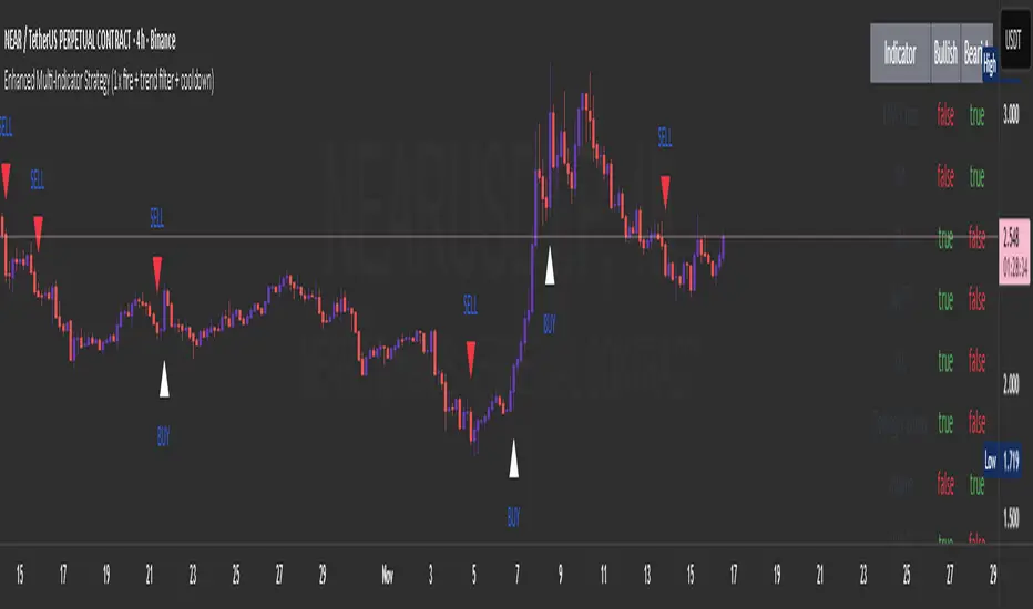 Enhanced Multi-Indicator Strategy v7 is a trend-following confirmation tool that combines several classic indicators into one clear “voting system.”