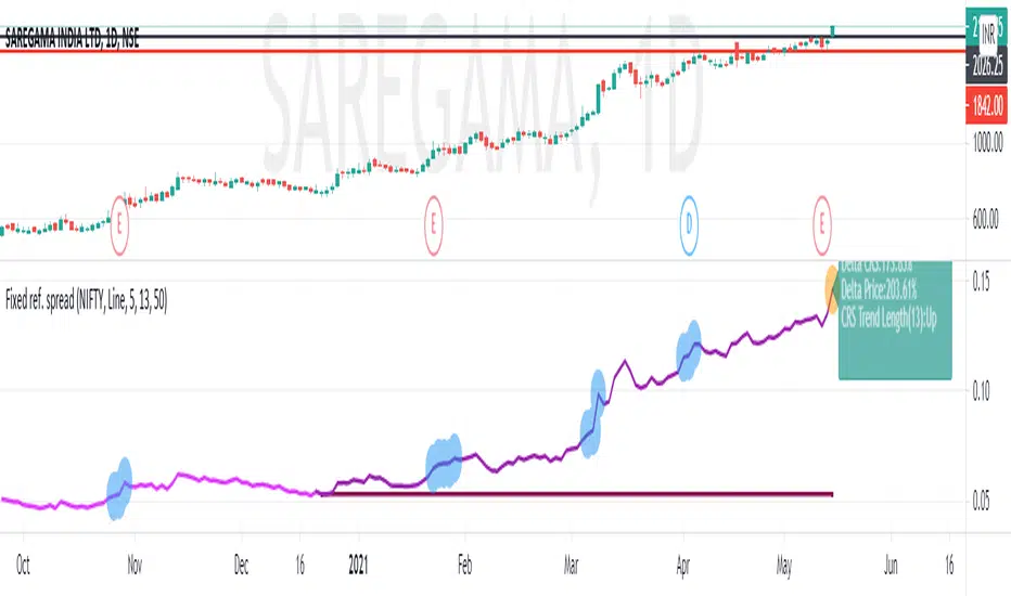 Often referred to as spread charts or ratio charts this is often used to measure the strength and performance of a script vis-a-vis a benchmark index. In this study, the comparison is plotted from a fixed reference session. On the current bar, the percentage change of the current ratio to the reference ratio is displayed as a label down icon, rounded to nearest integer. There are options to plot either a candle plot or line plot. The reference date can also be changed from the input dialog.