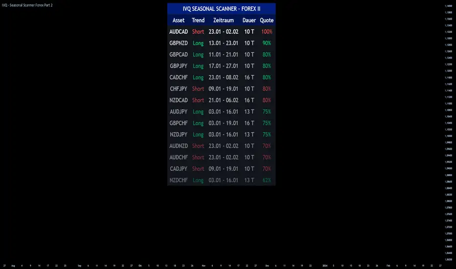 Scans the Forex market for the strongest seasonal patterns based on historical data. Ranks upcoming seasonal windows by win rate, duration, and time period, and presents all results in clear tables for efficient market selection in TradingView.