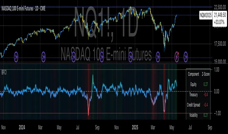 The implementation presented in this Pine Script indicator represents a proxy of the original Bloomberg Financial Conditions Index, attempting to capture its essential features while acknowledging several significant constraints. Most critically, while the original BFCI incorporates approximately 50 financial variables, this proxy version utilizes only six key market components due to data accessibility limitations within the TradingView platform.