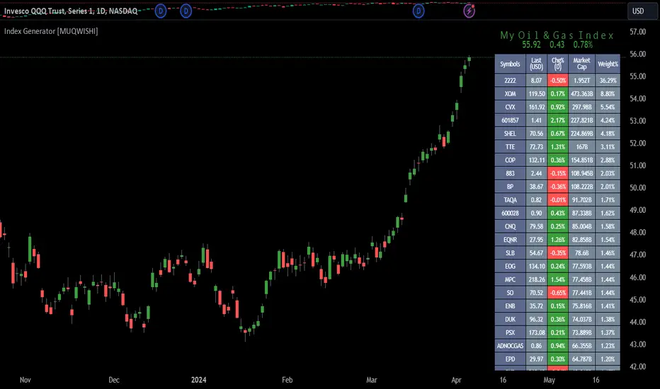 The image can be taken as an example of building a custom index. I created this index and named it “My Oil & Gas Index”. The index comprises several global energy companies. Essentially, the indicator weights each company by collecting the number of shares and then computes the market capitalization before sorting them as seen in the table.