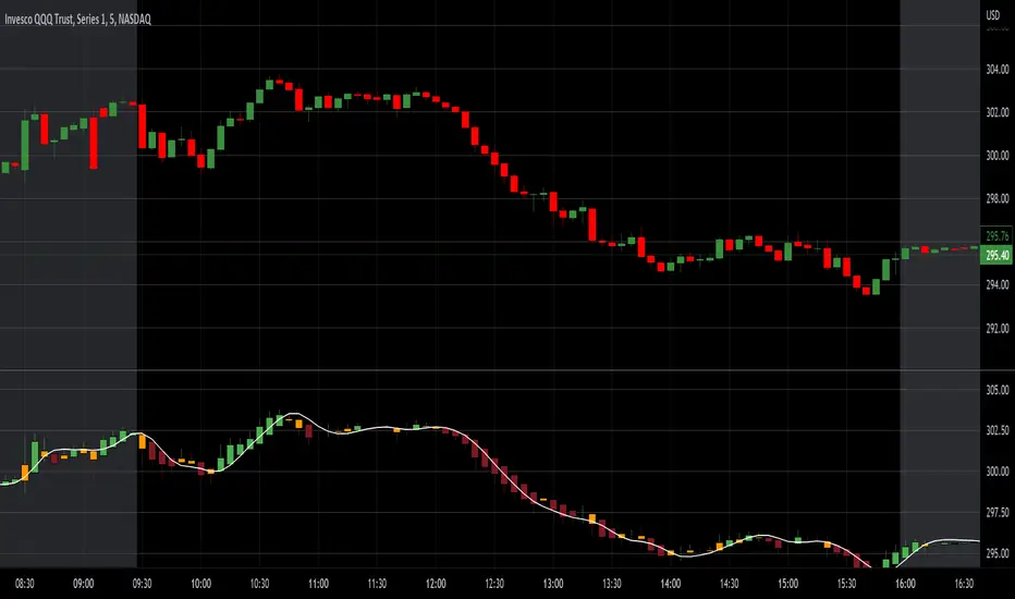 Nothing special about it other than displaying bull/bear ha candles with a twist of third color candle (orange default) which is shown when HA candle gets a wick in opposite direction of movement which usually indicates potential directional weakness.