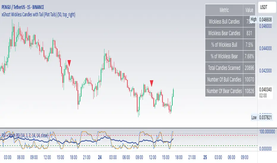 Simple script showing candles missing an upper or lower wick. As candles tend to have a low and a high, they will most certainly form wicks. It is rare to have wickless candles on longer time frames, so it's more relevant on 1h and above.