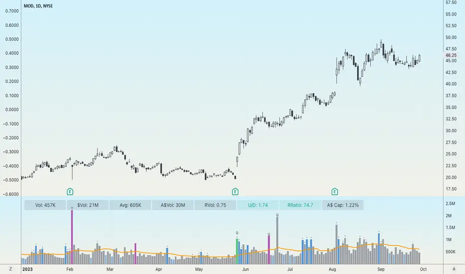 The main functionality of the indicator is to display volume that exceeds a certain level of relative volume with a specific color, and now it also differentiates between strong up and strong down days. The legacy mode from the previous version is still available, and the calculation error has been corrected in the legacy mode.